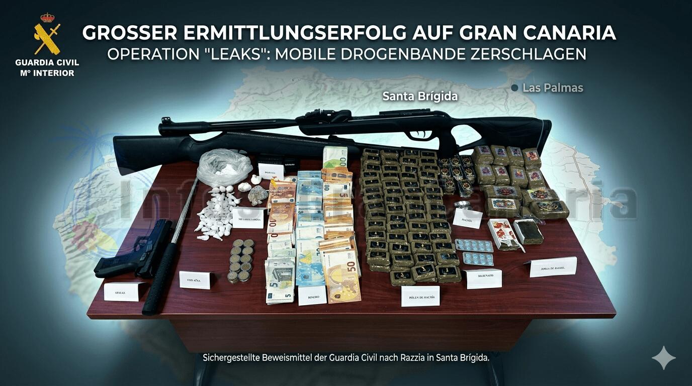 In der beschaulichen Gemeinde Santa Brígida auf Gran Canaria ist der Polizei ein empfindlicher Schlag gegen die lokale Drogenszene gelungen. Im Rahmen der strategisch angelegten „Operation LEAKS“ konnte die Guardia Civil eine mobile Verkaufsstelle für Betäubungsmittel vollständig demontieren. Drei Tatverdächtige im Alter zwischen 21 und 41 Jahren wurden dabei festgenommen.